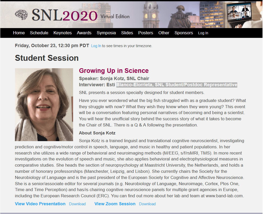 Our labdirector Sonja Kotz gave an interview about Growing Up in science during a student session. The interview was led by Esti Blanco-Elorrieta, SNL Student/Postdoc Representative and has been recorded. The recording is available through January 2021 on the SNL webpage, after log in.